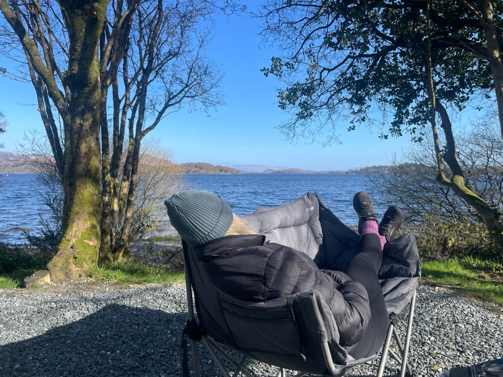 After our brekkie we hit the road for the 2hr 45 journey to Luss Campsite, right on the edge of Loch Lomond. You wouldn’t believe it is only 45 minutes from a very bustling and busy Glasgow! We had a Lochside pitch and it’s well worth the extra for one of these – we even had our own private lochside beach. Waking up to the sound of water lapping the shore and the hills looming in the morning sun shimmering on the calm water was something else.