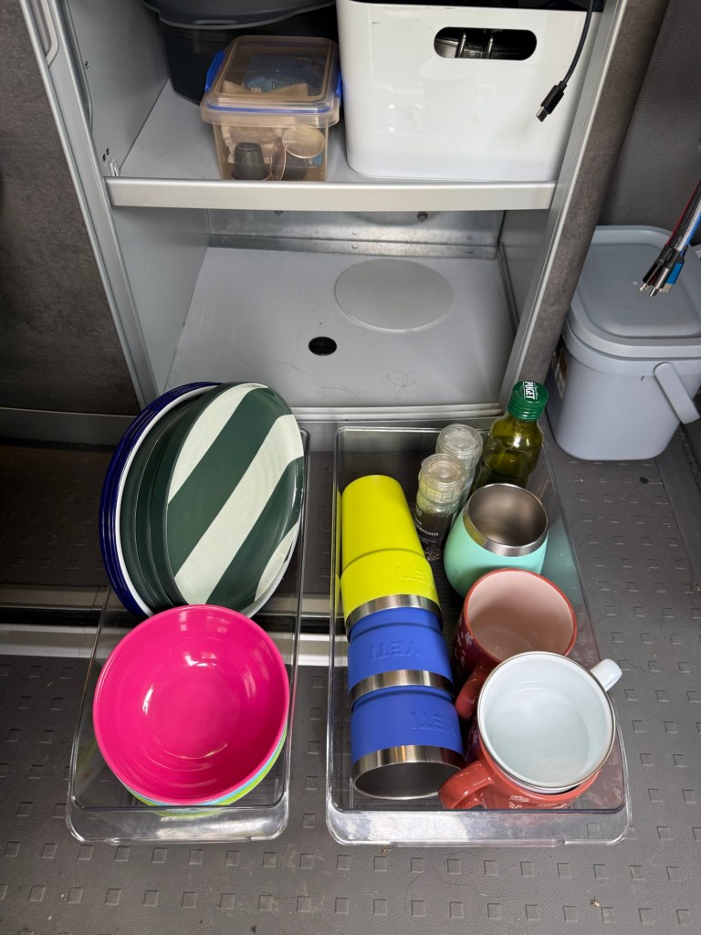 Before you buy these please check the size of your cupboards! These 2 fridge drawers fit either shelf of the VW California cupboard under the sink perfectly but other campers may vary in size. In the smaller drawer we have 3 melamine side plates, 3 enamel pasta bowls and 3 cereal bowls. In the large we have an assortment of mugs, plus salt & pepper mills and olive oil (staples we can’t be without). This is one of my favourite storage hacks, and you can just take the whole drawer out if you’re cooking outside for ease.